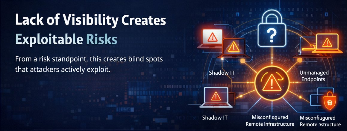 From a risk standpoint, this lack of visibility creates conditions attackers exploit deliberately. Shadow IT, unmanaged endpoints and misconfigured remote infrastructure frequently act as initial access vectors. Without visibility, these assets are excluded from vulnerability prioritisation, detection logic and access decisions until after compromise.