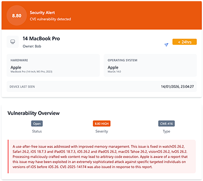 Assets are scanned continuously across remote, unmanaged, and corporate environments to identify vulnerabilities as they emerge.